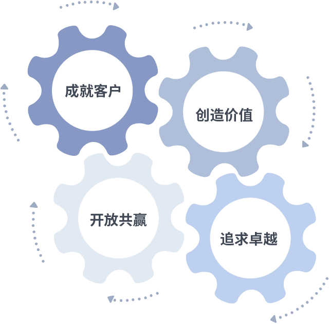 成就客户是一切决策的出发点,,创造价值是衡量所有工作的标准,,,追求卓越是我们做事做人的态度,,,开放共赢是我们的格局也是最终的结果。。。价值观的齿轮环环相扣,,推动着组织里的每个人不断向前。。。