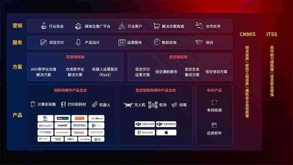 聚合国内外先进的物联网硬件产品品牌,,聚焦数字化仓储、、、、机器人运营、、低空智联网等领域,,共同打造适合客户业务场景的解决方案并提供交付服务